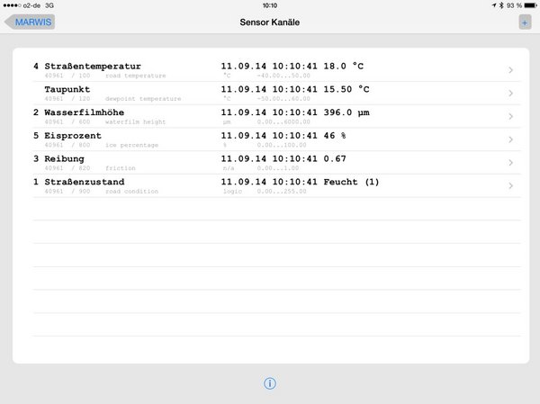 Hierbei werden ggf. Die vorher in den App-Einstellungen gesetzten Parameter (Marwis UMB Adresse, angelsächsische Einheiten) beachtet.